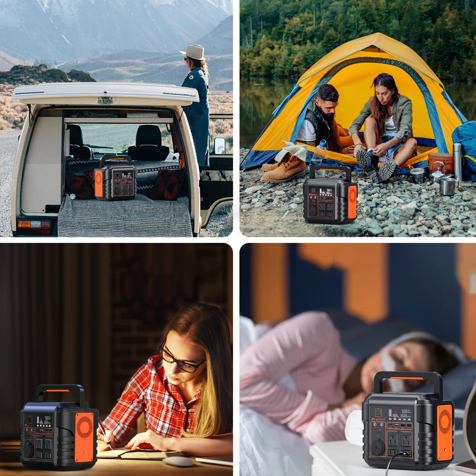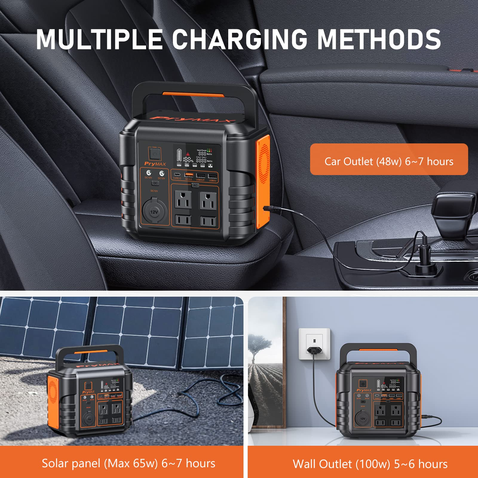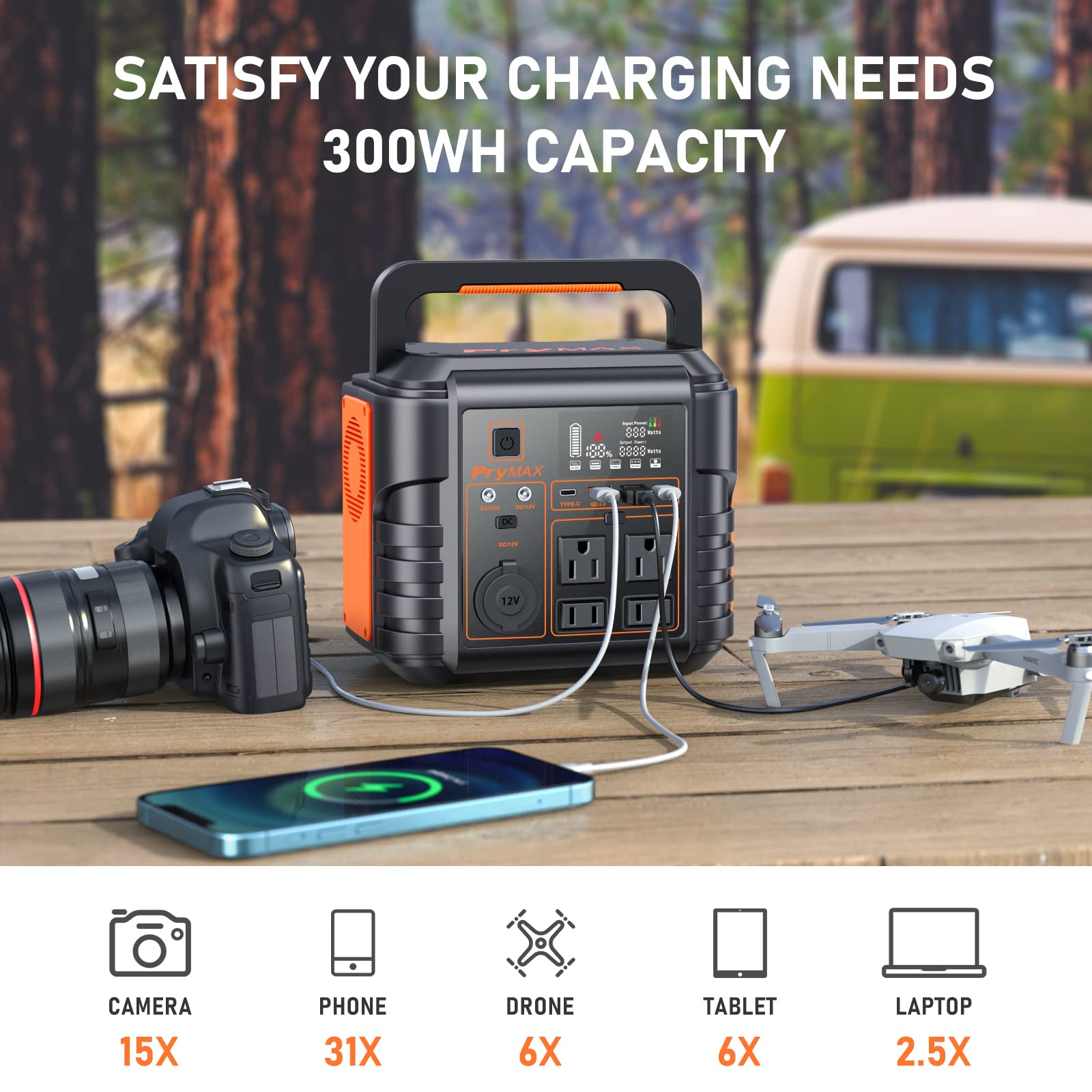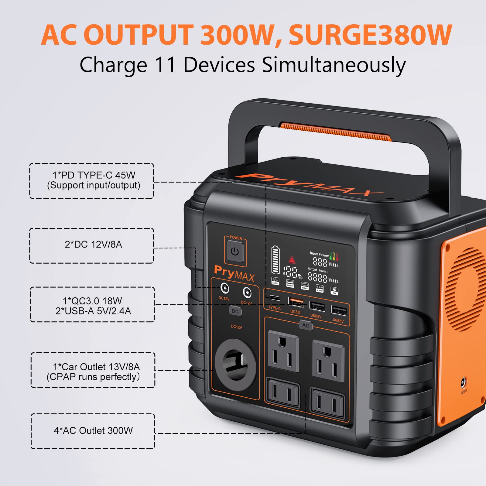 - 【Meet Your Charging Needs】 PryMAX 110V/330W 296Wh power station can charge 11 devices at the same time. It is equipped with 4*AC outlet, 2* USB-A, 1* USB-QC 3.0, 1* Type-C, 2* DC output, and 1* Cigarette lighter, which can charge phones, laptops, fans, mini radiators, cameras, drones, holiday lights.It is suitable for most of your outdoor activities.