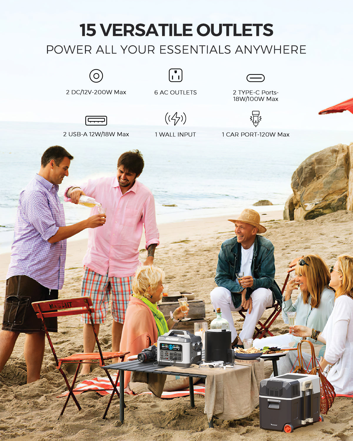 【Powerful & Versatile Ports】Features with AC/ PD/ DC/ USB outputs: 6*110V/1200W AC output, 2*12V/8A DC, 1*QC 3.0 quick charge,1*5V/2.4A USB port, 1*PD 18W, 1*PD 100W and 1*12V cigarette lighter. With USB-C PD 100W unique design: charge your MacBook and iPhone directly without an adapter. Also, multiple AC outlets will provide extra capacity to protect and power more AC devices and appliances.