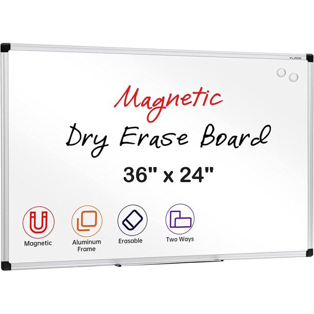 VUSIGN Magnetic Dry Erase Board is an excellent addition to any home or office. With a generous size of 36 X 24 inches, this board offers ample space for writing notes, brainstorming ideas, or presenting information. The wall-mounted design allows for easy installation and saves valuable desk or floor space. Featuring a sleek silver aluminum frame, the board adds a modern touch to any room. It also comes with a convenient pen tray, providing a dedicated place to store markers and erasers. The magnetic surface of the board adds versatility to its use, allowing you to attach notes, photos, or other documents with ease. Whether you are using it for work, school, or personal use, the VUSIGN Magnetic Dry Erase Board is a reliable and functional tool to have at your disposal.